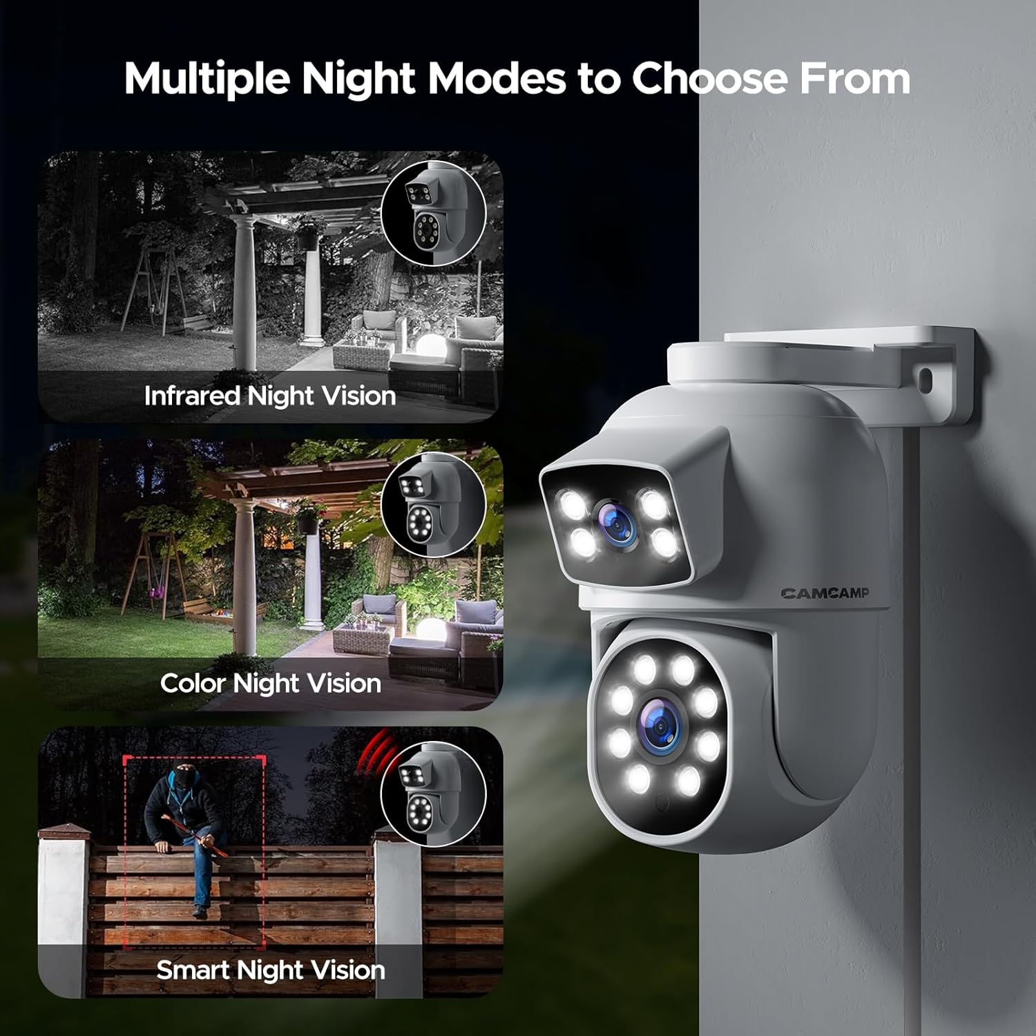 Dual Lens + Dual Screen Design The CAMCAMP POE camera system features a dual-lens design: one fixed wide-angle lens for constant monitoring and a PTZ (pan, tilt, zoom) lens for tracking intruders. This dual-functionality allows you to monitor larger areas and multiple directions simultaneously, eliminating blind spots and ensuring complete coverage.