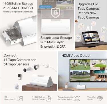 Connects up to 16 cameras & 64 sensors. Great if you want to display all your cameras on a hub or TV 24/7.